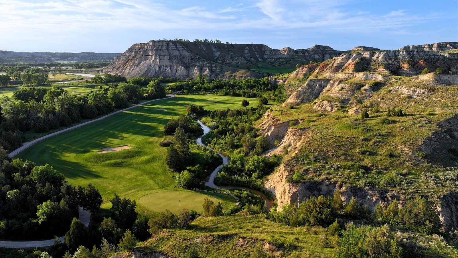 Bully Pulpit Golf Course is an 18-hole public golf layout carved dramatically out of the rugged North Dakota Badlands just outside Medora. The setting is what puts this course on the map: rolling meadows and woodlands give way to striking buttes and panoramic views that feel more like the American West than typical Midwestern golf terrain. As you wind your way around the par-72 course — stretching over about 7,100 yards from the tips — holes trace the edge of the Little Missouri River and climb toward elevated plateaus that offer sweeping vistas of the Badlands’ colorful rock formations. In recognition of its unique location and overall experience, the course was voted USA Today’s #1 Best Public Golf Course in the United States for 2025, a huge nod for a facility in a region not usually associated with “must-play” golf.