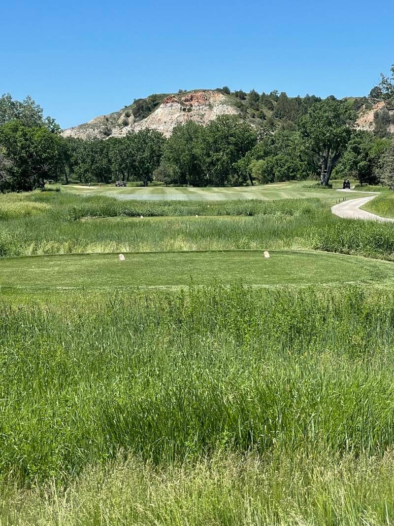 The front nine eases you into the round, winding through river bottoms and gentler terrain with wide landing areas and subtle elevation changes. Huge cottonwood trees release cotton into the air that can easily hide a golf ball. But the back nine is where the course reveals its true character. Here, holes climb onto plateaus and skirt the edges of eroded buttes, creating memorable visuals and demanding thoughtful shot-making. The contrast between lush green fairways and the pale, weathered Badlands formations is striking — and unforgettable.