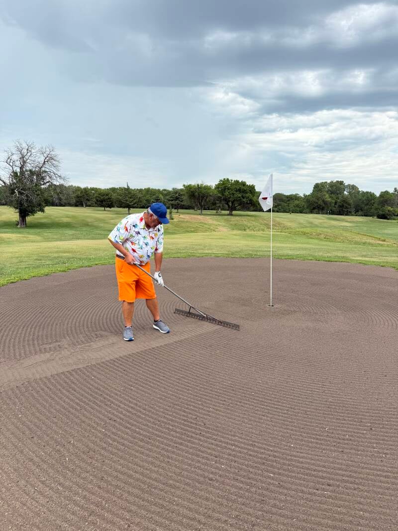 After holing out, the final act: return the roller, take the rake, and restore the green to pristine symmetry for the next group.