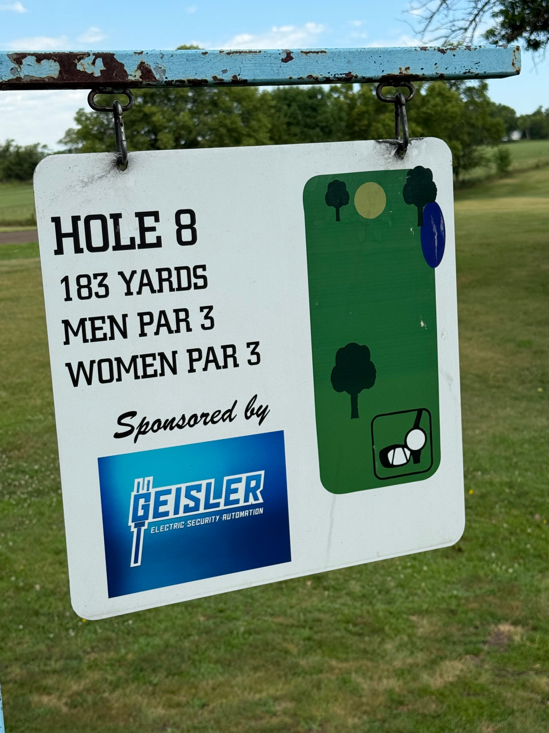 Behind each green stood a painted blue steel pole holding three tools: a very heavy roller, an equally heavy rake and a small cup used to remove water from the hole or to put sand around the cups edge.